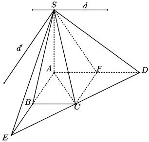 | d) Giao tuyến của ($SAB$) và ($SFC$) là đường thẳng $d'$ đi qua $S$ và song song cạnh $CD$ |