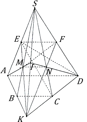 Cho hình chóp $S.ABCD$ có đáy $ABCD$ là hình thang ($AD$ là đáy lớn, $BC$ là đáy nhỏ). Gọi $E,F$ lần lượt là trung điểm của $SA$ và $SD.K$ là giao điểm của các đường thẳng $AB$ và $CD$. Khi đó: