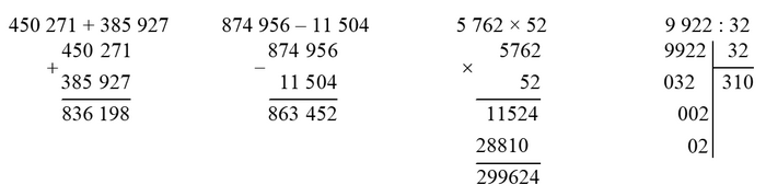 Đặt tính rồi tính:a) 450 271 + 385 927b) 874 956 – 11 504c) 5 762 × 52d) 9 922 :