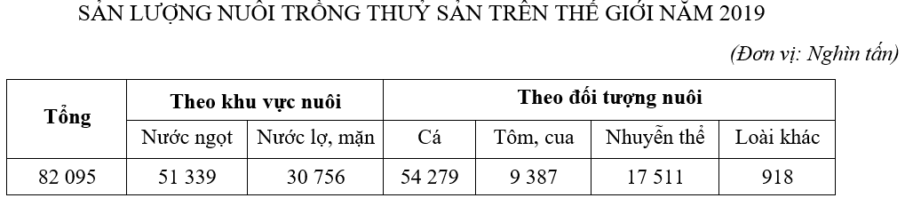 Theo bảng số liệu, nhận xét nào sau đây không đúng về nuôi trồng thuỷ sản trên thế giới năm 2019?