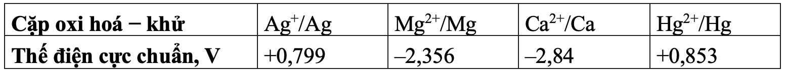 Cho các cặp oxi hoá − khử của các kim loại và thế điện cực chuẩn tương ứng: