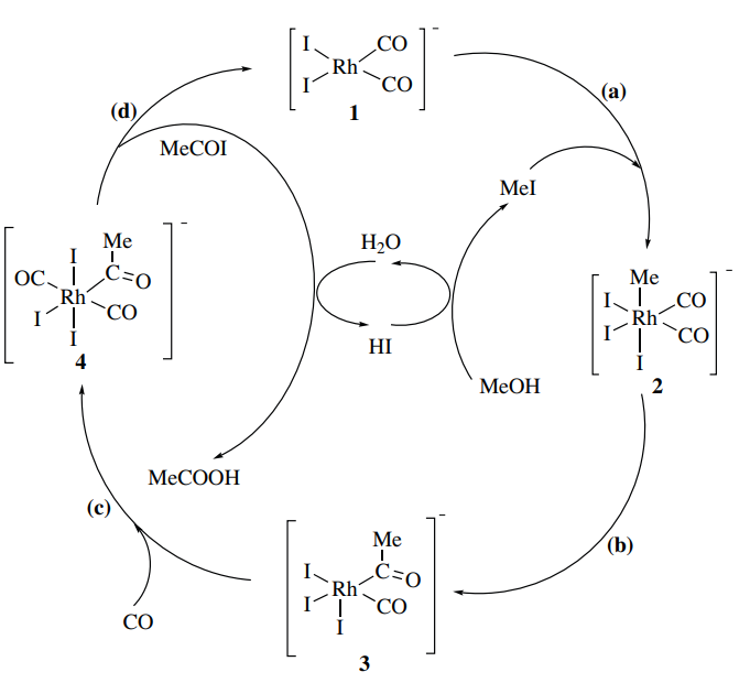 Hệ thống xúc tác chứa nguồn rhodium (ví dụ: RhCl3, hoặc [RhCl(CO)(PPh3)2]) và các ion iodide (HI). Chất xúc tác hoạt động là cis-[Rh(CO)2 I2]–.