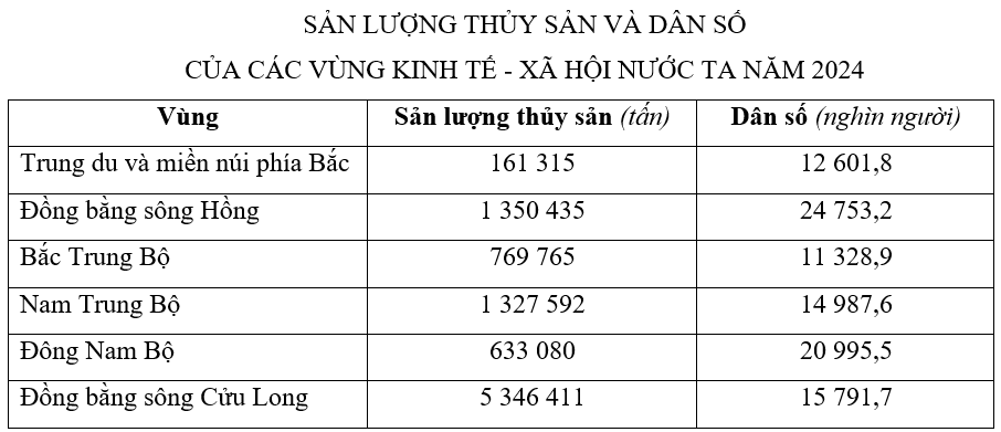Căn cứ vào bảng số liệu trên, hãy cho biết vùng kinh tế - xã hội nào của nước ta có sản lượng thủy sản bình quân đầu người cao nhất cả nước năm 2024.