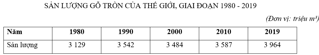 - Nhận xét: dựa vào bảng số liệu để nhận xét chung về sự thay đổi sản lượng gỗ tròn của thế giới giai đoạn 1980 - 2019. Sau đó, nhận xét từng giai đoạn, nêu dẫn chứng cụ thế.
