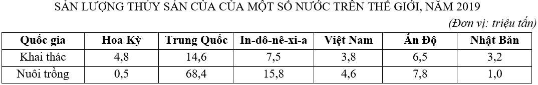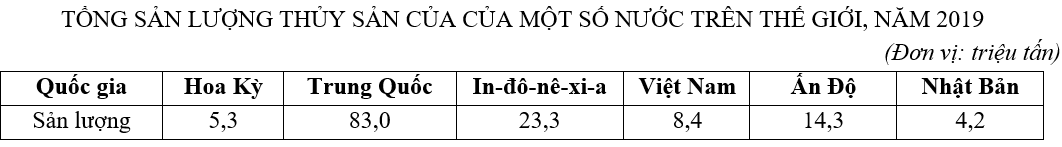 + Từ đó, lập bảng tổng sản lượng thủy sản của một số quốc gia trên thế giới năm 2019.