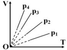 Trên đồ thị $(V,T)$ (hình bên) vẽ bốn đường đẳng áp của cùng một lượng khí xác định. Đường ứng với áp suất thấp nhất là