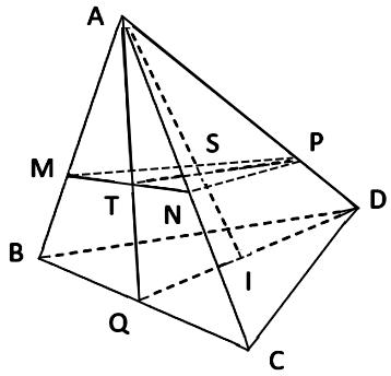 Cho tứ diện $ABCD$. Gọi $M,N,P$ lần lượt thuộc các cạnh $AB,AC$ và $AD$ sao cho $AM = 2MB,AN = NC$ và $AP = 3PD$. Gọi $Q$ là trung điểm cạnh $BC,I$ là trung điểm của
