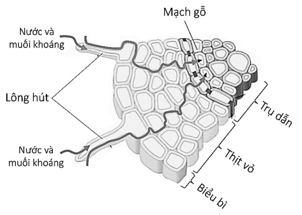 Dựa vào sơ đồ hãy mô tả được con đường hấp thụ, vận chuyển nước và khoáng của cây