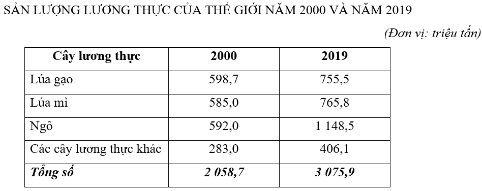 + Từ đó, lập bảng cơ cấu sản lượng lương thực thế giới năm 2000 và năm 2019.