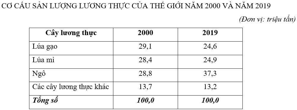 Dựa vào bảng số liệu trên, hãy nhận xét và giải thích về sự thay đổi quy mô, cơ cấu sản lượng lương thực thế giới năm 2019 so với năm 2000.