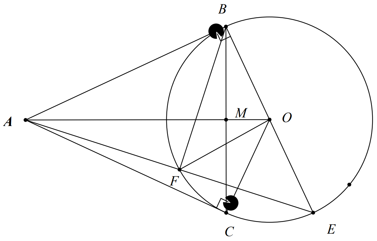 Cho đường tròn $(O)$. Qua $A$ nằm ngoài đường tròn vẽ tiếp tuyến $AB;AC$ với đường tròn $(O)$ ($B;C$ là các tiếp điểm); $OA$ cắt $BC$ tại $M$.