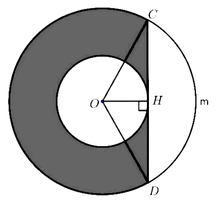 b) Cho hai đường tròn đồng tâm $\left( {\text{O};8\text{cm}} \right)$ và $\left( {\text{O};4\text{cm}} \right)$. Gọi CD là tiếp tuyến của đường tròn $\left( {\text{O};4\text{cm}} \right)$ tại H như hình vẽ. Tính diện tích phần hình vành khăn giới hạn bởi tiếp tuyến $CD$ và cung lớn $CD$ (phần tô màu đậm) với $\pi \approx 3,14$ và làm tròn kết quả đến hàng phần trăm.