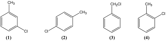 Trong các chất trên, những chất là sản phẩm chính khi cho toluene tác dụng với chlorine trong điều kiện đun nóng và có mặt FeCl3 là (Viết lần lượt STT các chất)