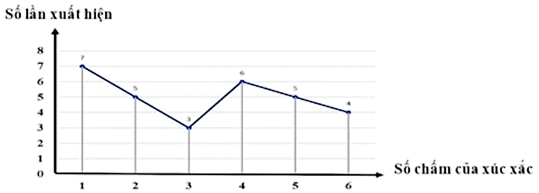 Bạn A gieo một con xúc xắc cân đối và đồng chất nhiều lần. Các kết quả sau khi kết thúc việc gieo con xúc xắc được bạn Bình thể hiện trong biểu đồ đoạn thẳng sau: