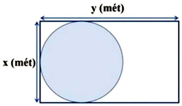 Một khu vườn hình chữ nhật có chiều rộng là x (mét), chiều dài là y (mét). Bác Cường dự định xây một cái hồ hình tròn tiếp xúc với các cạnh của khu vườn như hình vẽ.