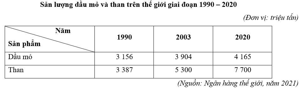 b) Nhận xét sự thay đổi sản lượng dầu mỏ và than trên thế giới giai đoạn 1990 – 2020.