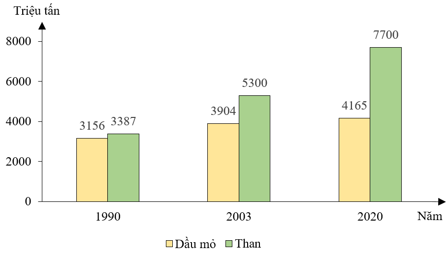 b) Nhận xét sự thay đổi sản lượng dầu mỏ và than trên thế giới giai đoạn 1990 – 2020 (tăng từ bao nhiêu lên bao nhiêu, sản lượng nào tăng nhanh hơn).