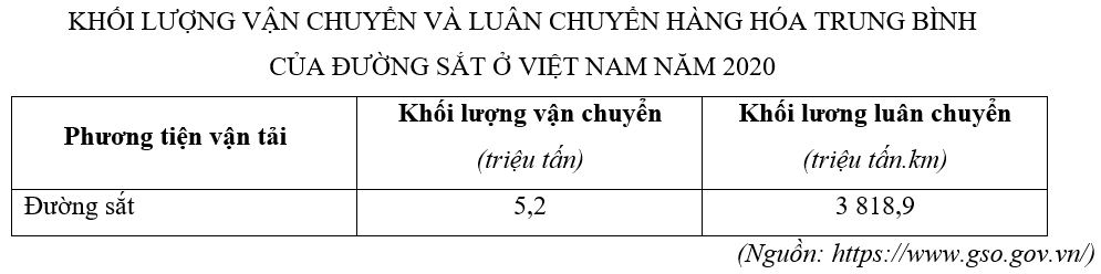 Căn cứ vào bảng số liệu trên, tính cự li vận chuyển trung bình của đường sắt nước ta năm 2020 (làm tròn kết quả đến hàng đơn vị của km)