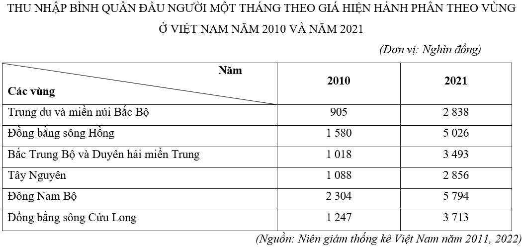 Dựa vào bảng số liệu và nhận xét sự phân hoá thu nhập bình quân đầu người một tháng phân theo vùng ở Việt Nam năm 2010 và năm 2021: