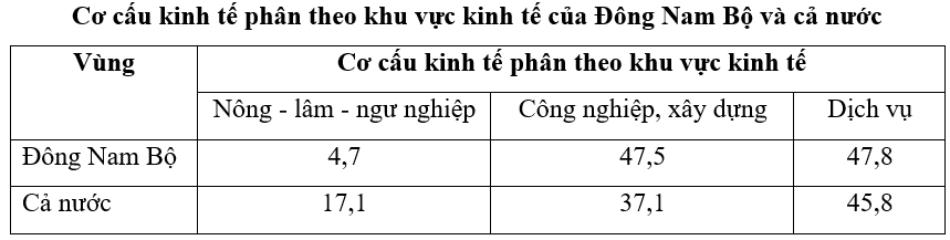 Dựa vào bảng số liệu và tìm ra ngành chiếm tỷ trọng nhỏ nhất của Đông Nam Bộ.