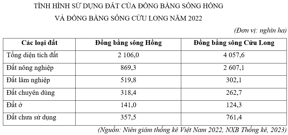 | b) Đất nông nghiệp chiếm phần lớn diện tích đất của Đồng bằng sông Cửu Long và gấp 3,5 lần diện tích đất nông nghiệp Đồng bằng sông Hồng. | ||