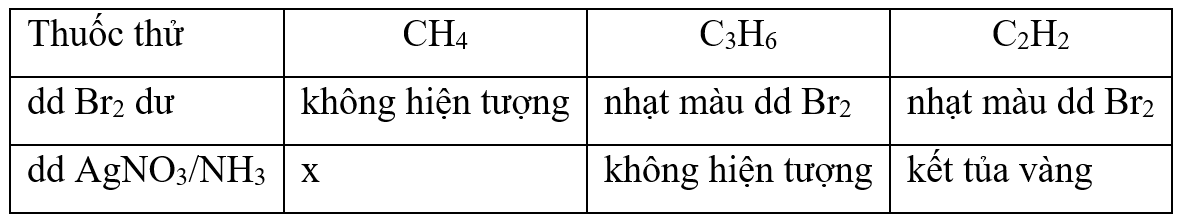 Trình bày phương pháp hoá học phân biệt ba bình không dán nhãn chứa mỗi khí không màu sau: methane, propylene, acethylene