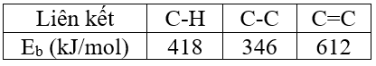 Cho giá trị trung bình của các năng lượng liên kết ở điều kiện chuẩn:Biến thiên enthalpy