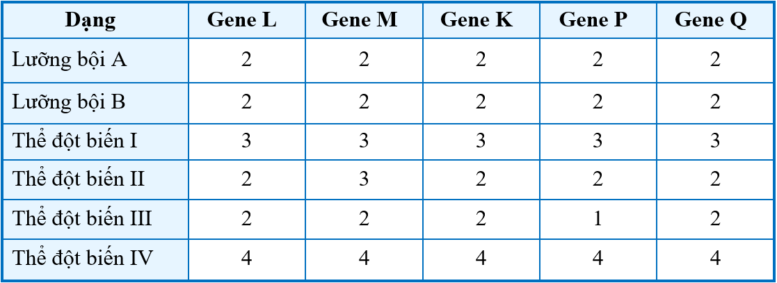 Ở một loài thực vật (2n = 10), xét 6 gene được kí hiệu là L, M, K, P, Q. Biết các gene nằm trên các cặp nhiễm sắc thể tương đồng khác nhau. Trong loài đã xuất hiện 4 dạng thể đột biến số lượng nhiễm sắc thể được kí hiệu từ I đến IV. Nghiên cứu số lượng bản sao của các gene ở thể lưỡng bội và ở các thể đột biến, kết quả thu được bảng sau