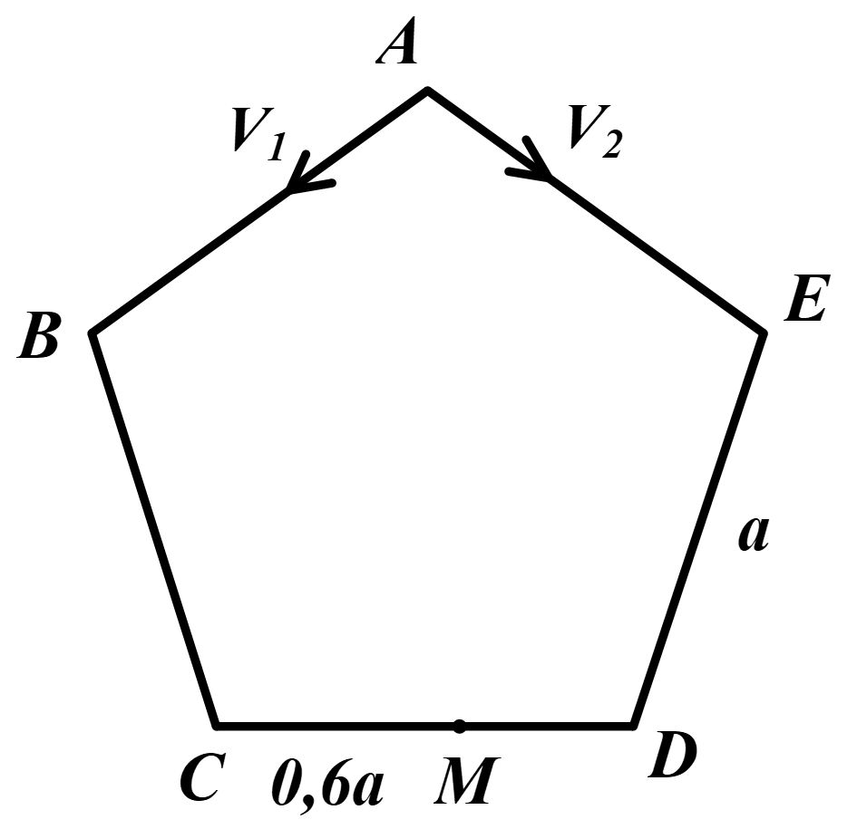 Hai người $V_{1}$ và $V_{2}$ xuất phát cùng lúc từ đỉnh A của đường đua hình ngũ giác đều ABCDE cạnh a.