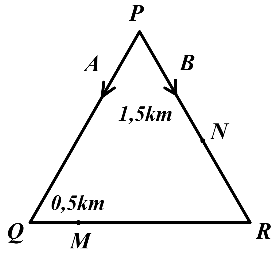 Hai vận động viên A và B xuất phát cùng lúc từ đỉnh P của một sân vận động hình tam giác đều PQR cạnh $a$ (km).