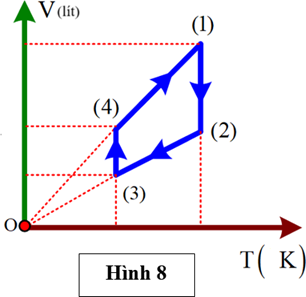 Một khối khí lí tưởng thực hiện chu trình $\left. 1\rightarrow 2\rightarrow 3\rightarrow 4\rightarrow 1 \right.$ như hình 8. Biết khối khí ở trạng thái (1) có $\text{T}_{1} = 300~\text{K};\text{V}_{1} = 50$ lít, và ở trạng thái (3) có $\text{T}_{3} = 150~\text{K};\text{V}_{3} = 12,5$ lít; $\text{p}_{3} = 3,5 \cdot 10^{5}~\text{Pa}$.