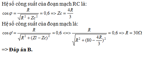 =80Ω. Hệ số công suất của RC bằng hệ số công suất của cả mạch và bằng 0,6.Điện trở thuần R có giá trị :