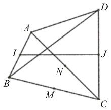 Cho tứ giác ABCD. Gọi I, J theo thứ tự là trung điểm của AB, CD và \(I