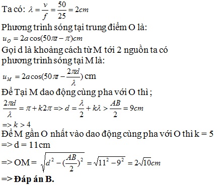 (với t tính bằng s ). Tốc độ truyền song của mặt chất lỏng bằng 50cm/s. Gọi O là trung điểm của AB, Điểm M ở mặt chất lỏng nằm trên đường trung trực của AB và gần O nhất sao cho phần tử chất lỏng tại M dao động cùng pha với phần tử chất lỏng tại O. Khoảng cách MO là