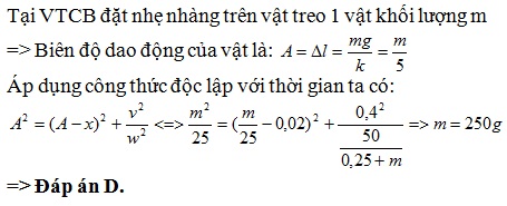 Một vật có khối lượng M=250g đang cân bằng trên một lò xo có độ cứng k=50N/m. Người ta đặt nhẹ nhàng lên vật treo một vật có khối lượng m thì cả hai bắt đầu dao dộng điều hòa trên phương thẳng đứng và khi cách vị trí ban đầu 2cm thì chúng có tốc độ 40cm/s. Lấy g=10m/