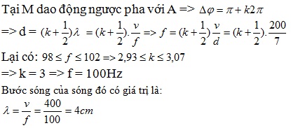 Một sợi dây đàn hồi rất dài có đầu A dao động với tần số f theo phương vuông góc với sợi dây.Biên độ dao động là a, vận tốc truyền sóng trên dây là 4m/s.Xét điểm M trên dây và cách A một đoạn 14cm, người ta thấy M dao động ngược pha với A.Biết tần số f có giá tri trong khoảng từ 98Hz đến 102Hz.Bước sóng của sóng đó có giá trị là:
