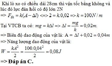 .Khi lò xo có chiều dài 28cm thì vận tốc bằng không và lúc đó lực đàn hồi có độ lớn 2N.Năng lượng dao động của vật là: