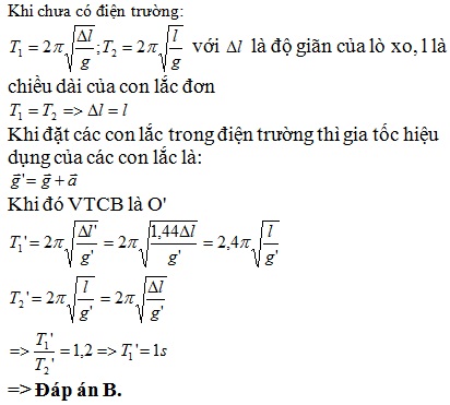 .Khi đặt cả hai con lắc trong cùng một điện trường đều có vec tơ cường độ điện trường E nằm ngang thì độ dãn của con lắc lò xo tăng 1,44 lần, con lắc đơn dao động với chu kỳ 5/6s.Chu kỳ dao dộng của con lắc lò so trong điện trường đều là