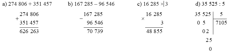 Đặt tính rồi tính:a) 274 806 + 351 457 b) 167 285 – 96 546 c) 16 285 × 3 d) 35 525 :