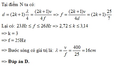 (k thuộc Z). Biết tần số f có giá trị từ 23z đến 26Hz.Bước sóng của sóng đó là: