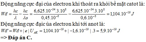 Chiếu bức xạ có bước sóng λ= 0, 45μm vào bề mặt catot của tế bào quang điện có bước sóng giới hạn