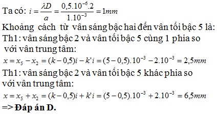 Trong thí nghiệm giao thoa ánh áng bằng khe Young khoảng cách giữa hai khe sáng là 1 mm, khoảng cách từ hai khe đến màn là 2m. Bước sóng ánh sáng dùng trong thí nghiệm là 0,5 μm Khoảng cách từ vân sáng bậc hai đến vân tối bậc 5 là: