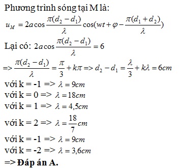 Trong hiện tượng giao thoa trên mặt nước, hai nguồn đồng bộ có cùng biên độ 3cm. Phương trình dao động tại điểm M có hiệu khoảng cách đến 2 nguồn là 6cm có: