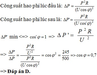 Công suất hao phí trên đường dây tải 500W. Sau đó người ta mắc thêm vào mạch tụ điện để công suất hao phí giảm đến cực tiểu là 245W. Tìm hệ số công suất của mạch lúc đầu