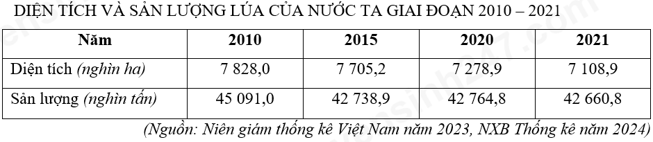 Cho bảng số liệu:Dựa vào bảng số liệu, hãy cho biết năng suất lúa của nước ta năm 2021 là