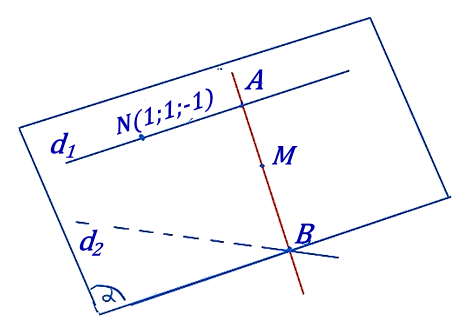 Viết phương trình $(\alpha)$ chưa $d_{1},\Delta$ từ đó tìm giao điểm của $d_{2}$ và $(\alpha)$ là B