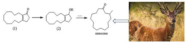 Muscone là hợp chất hữu cơ tạo nên mùi thơm đặc trưng của xạ hương, được sử dụng phổ biến trong công nghiệp nước hoa, mỹ phẩm và y học. Trước đây xạ hương tự nhiên lấy từ tuyến thơm của loài hươu xạ. Ngày nay nhằm bảo tồn loài hươu, người ta tìm ra con đường tổng hợp muscone như sau: