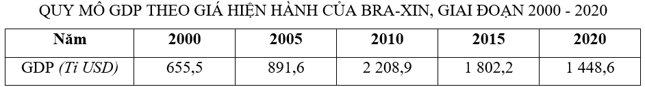 Căn cứ vào bảng số liệu trên, tính tốc độ tăng trưởng GDP của Bra-xin năm 2015. Lấy năm 2000 là năm gốc. (Làm tròn đến kết quả hàng đơn vị của %)