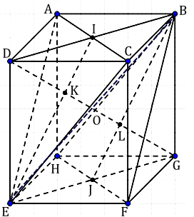 Cho hình hộp $ABCD.HGFE$. Gọi $K$, $L$ lần lượt là giao điểm của $DG$ với các mặt phẳng $\left( {ECA} \right)$và $\left( {BHF} \right)$. Gọi $I,J$ lần lượt là trung điểm của $AC$ và $HF$. Những phương án nào dưới đây đúng?