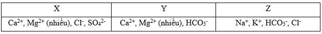 Cho các loại nước được đánh dấu X, Y, Z có chứa các ion theo bảng